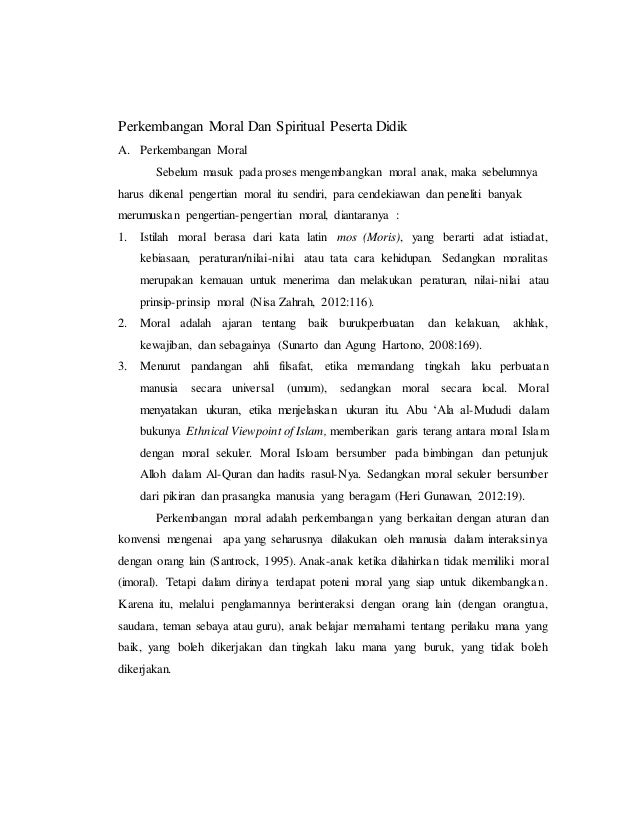 Pengertian perkembangan moral sebelum memahami pengertian perkembangan moral maka terlebih dahulu perlu dipahami pengertian moral. Sementara d.s wright dan ann taylor Teori ini berpandangan bahwa penalaran moral, yang merupakan dasar dari perilaku etis, mempunyai enam stadium perkembangan dengan tiga tahapan yang teridentifikasi.kohlberg memberikan berbagai kasus dilema moral dengan tingkat kompleksitas yang berbeda. Seseorang telah mengembangkan aspek moral bila telah menginternalisasikan aturan2 or kaidah2 kehidupan di dalam masyarakat, dan dapat mengaktualisasikan dalam perilaku yang terus menerus, atau dengan kata lain telah menetap. Pengertian perkembangan moral pengertian perkembangan secara luas menunjuk pada keseluruhan proses perubahan dari potensi yang dimiliki individu dan tampil dalam kualitas kemampuan, sifat dan. Bab ii pembahasan perkambangan moral dan sosial anak a. Menurut purwadarminto (dalam sunarto, 2008) moral adalah ajaran tentang baik buruk perbuatan dan kelakuan, akhlak, kewajiban, dan sebagainya. Moral adalah suatu bentuk ajaran yang diturunkan secara terus menerus sehingga perbuatan tersebut mecerminkan arti kebaikan dan keburukan dan berperilaku. Perkembangan moral adalah perubahan penalaran, perasaan, dan perilaku tentang standar mengenai benar dan salah. Dalam moral diatur segala perbuatan yang dinilai baik dan perlu dilakukan, dan suatu perbuatan yang dinilai tidak baik dan perlu dihindari. Perkembangan moral menurut teori belajar sosial Hal terpenting yang harus diketahui berkaitan dengan pemahaman kepribadian adalah bahwa pemahaman itu sangat. Adalah tahap perkembangan moral kedua , yang tercapai pada usia 10 tahun atau lebih.